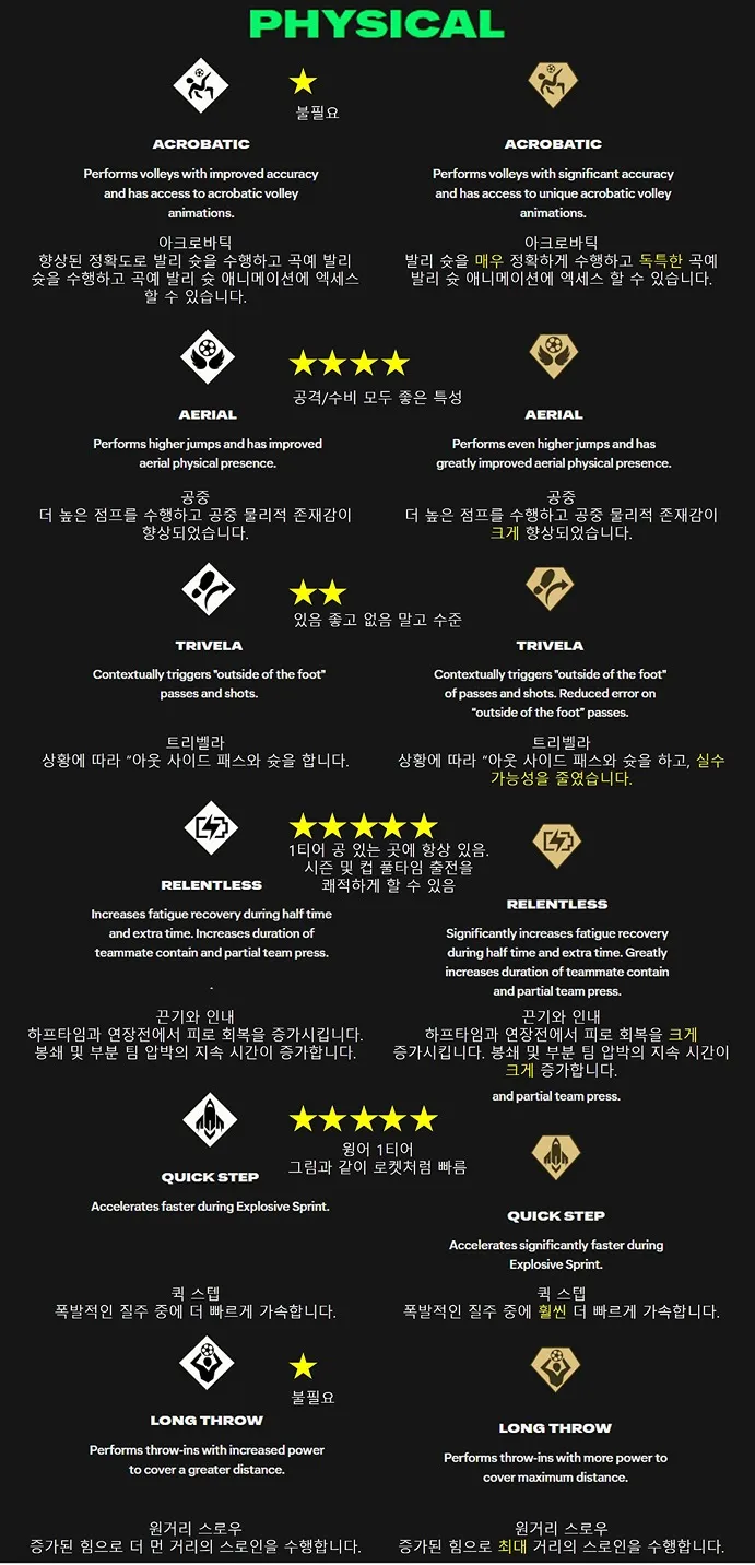 아크로바틱(Acrobatic), 공중(Aerial), 트리벨라(Trivela), 끈기와 인내(Relentless), 퀵 스텝(Quick Step), 원거리 스로우(Long Throw)로 세분화됩니다.