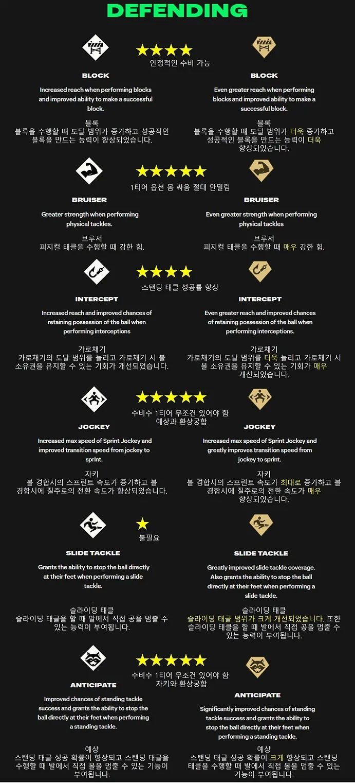 블록(Block), 브루저(Bruiser), 가로채기(Intercept), 견제(Jockey), 슬라이딩 태클(Slide Tackle), 예상(Anticipate)으로 세분화됩니다.