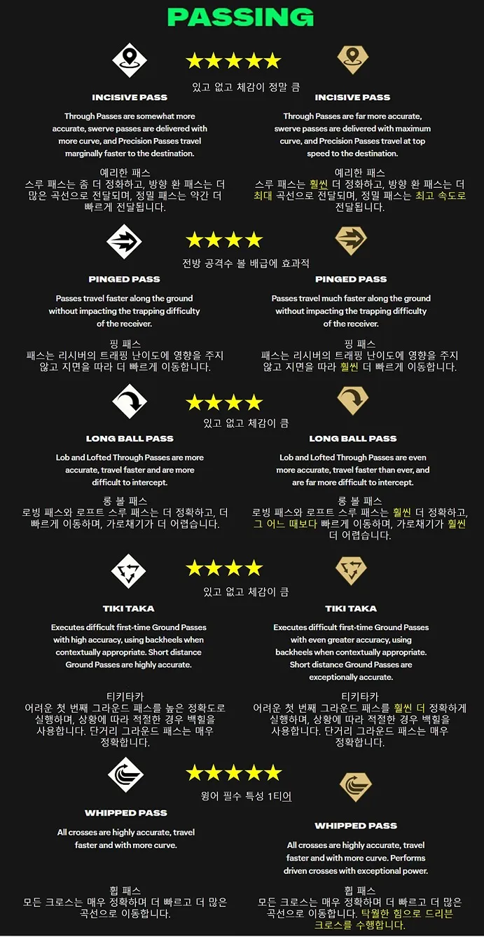 예리한 패스Incisive Pass), 핑 패스(Pinged Pass), 롱 볼 패스(Long Ball Pass), 티키타카(Tiki Taka), 휩 패스(Whipped Pass)로 세분화됩니다.
