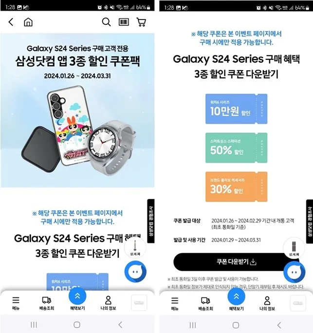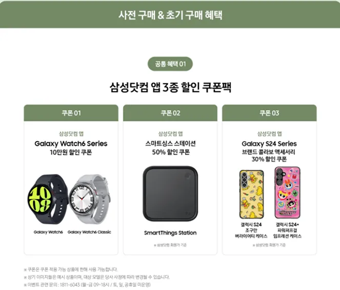 구매한 Galaxy S24 Series를 개통 후 첫 통화를 하고 나면 3일 후에 해당 단말기로 삼성닷컴 어플에서 Galaxy S24 Series 구매 고객전용 삼성닷컴 앱 3종 할인 쿠폰팩을 발급받을 수 있습니다. 쿠폰팩의 구성은 Galaxy Watch 6 Series 10만원 할인, 스마트싱스 스테이션 50% 할인, 브랜트콜라보 액세서리 30% 할인까지 3종입니다.