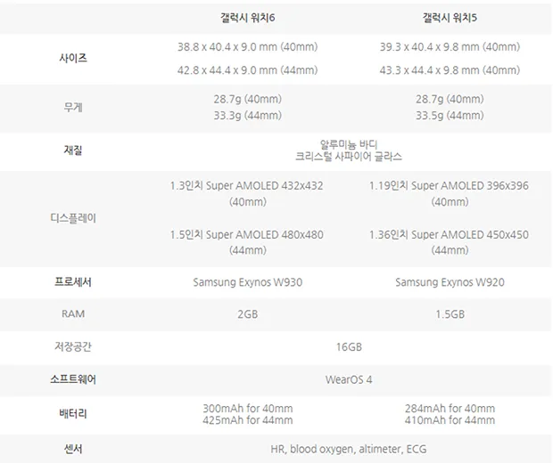 워치6의 AP가 엑시노스 W920(5나노)에서 W930(5나노)로 바뀌었습니다. W930은 1.4Ghz 클럭의 Arm Cortex-A55 듀얼코어 CPU가 장착되었습니다. 그리고 램도 1.5GB에서 2GB로 늘어났습니다. 그래서 확실히 처리 속도와 반응이 향상되었습니다. CPU클럭과 2GB로 늘어난 램을 장착하여 W920보다 최대 25% 빠른 앱 전환이 가능합니다. 그리고 하드용량은 갤럭시 워치 5와 마찬가지로 16GB로 동일입니다.