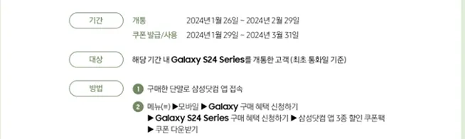 해당 쿠폰은 2024년 1월 26일부터 2024년 2월 29일까지 개통한 구매고객 대상으로 2024년 1월 29일부터 2024년 3월 31일까지 쿠폰을 발급 및 사용이 가능합니다.