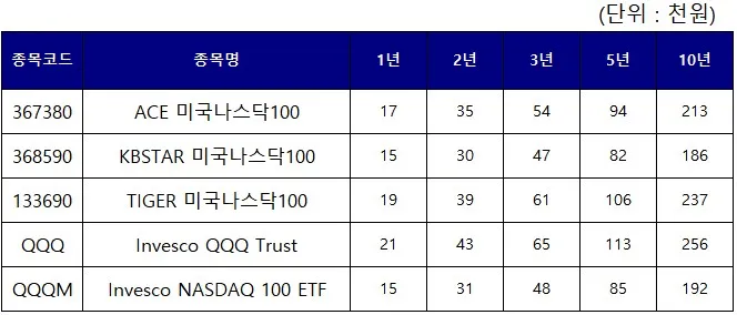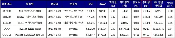 투자상황별 비교(TIGER, ACE, KBSTAR, QQQ, QQQM)
