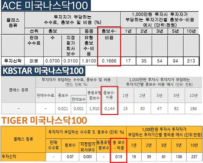 국내 상장된 ETF의 경우 표면적으로 나오는 수수료만 보시면 안 됩니다.국내 상장 ETF가 내세우는 수수료의 개념은 순수한 운용에 대한 보수입니다. 다른 비용은 포함되어 있지 않습니다. 따라서 각 사의 홈페이지나 전자공시시스템에서 꼭 투자설명서를 찾아서 보시기 바랍니다.그럼 아래와 같이 총비용이 나오니 이것으로 비교해야 합니다. 장기 투자를 하는 패시브 ETF 투자에서 중요한 사항은 수수료입니다. 수수료가 작다고는 하지만 장기투자인 만큼 수수료비용도 복리효과로 인해 차이는 눈에 띄게 나타나기 때문에 중요한 고려사항이니, 반드시 비교하시기 바랍니다.