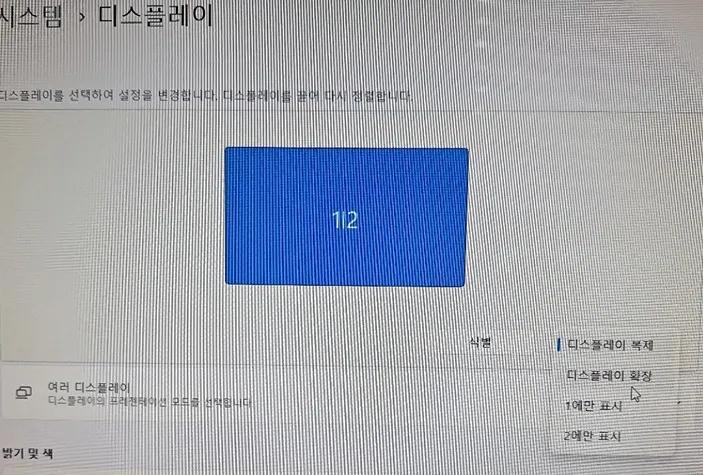 처음에는 디스플레이 복제로 되어 있는 것을 누르면 드롭박스에 디스플레이 확장으로 변경하여 줍니다.
