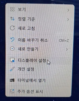 바탕화면에서 마우스 오른쪽 버튼을 클릭한후 메뉴에서 디스플레이 설정을 선택합니다.