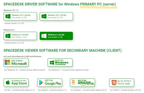 일단 본체 PC에 Spacedesk를 설치해야합니다. 웹에서 Spacedesk를 검색하여 홈페이지에 들어가면 초록색 Download 다운로드 버튼을 눌러줍니다.