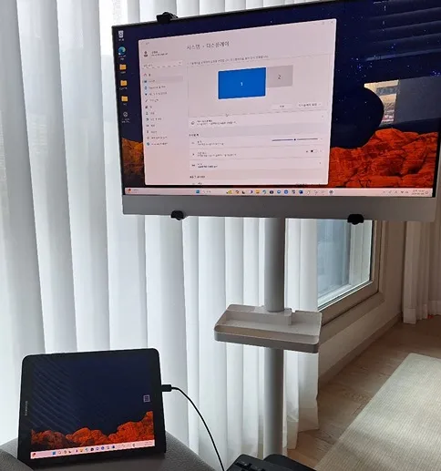 최종 완료된 모습입니다. 화면의 위치는 본인에 맞게 사용하시면 됩니다. 듀얼 모니터로 사용되는 태블릿 PC의 해상도가 살짝 떨어지기는 하지만, 간단하게 옆에 참고 화면을 띄워놓고 사용하기에 안성맞춤입니다.심지어 듀얼 모니터로 사용되는 화면은 마우스가 아닌 터치로 컨트롤을 할 수 있습니다.